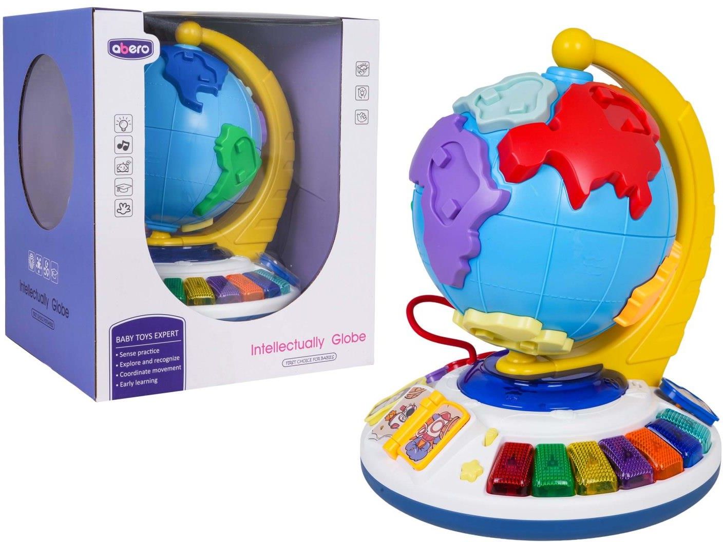 Opis Interaktywny Globus Poznaj Świat Interaktywny globus z funkcją dźwięku i światła dla dzieci od osiemnastego miesiąca życia. Zabawka edukacyjna wykonana została z najlepszej jakości materiałów w żywych kolorach. W części przedstawiającej kulę ziemską umiejscowiono wypukłe elementy imitujące kontynenty. Na każdym z kontynentów znajduje się wgłębienie na umiejscowienie przypinki z obrazkiem zwierzaka, jakie żyje na tym kontynencie. W zestawie mamy 7 kontynentów i 7 przypinek ze zwierzakami. Globus możemy obracać o 360 stopni wokół swojej stałej podstawy. Pod globusem znajduje się solidna podstawa, na której umiejscowiono wgłębienia na przypinki z obrazki zwierzątek (te same co przy kontynentach), pianinko z podświetleniem i kolorowymi klawiszami, książeczkę z przekładanymi kartkami oraz przekładankę z koralikami. Globus będzie idealnym narzędziem, aby zachęcić maluchy do nauki i pokochania geografii. Pomoże dzieciom przez zabawę poznać kontynenty i ich umiejscowienie na kuli ziemskiej, zwierzęta, kształty i kolory. Ponadto rozwija umiejętności motoryczne, zmysł dotyku, zręczność, koordynację wzrokowo-ruchową i wyobraźnię. Zabawka zasilana jest bateriami typu 3 x AA 1,5 V (brak w zestawie). Funkcje: dla dzieci od osiemnastego miesiąca życia, wykonany z bezpiecznych dla dzieci materiałów najlepszej jakości, bogactwo kolorów przyciąga wzrok dziecka i zachęca do edukacyjnej zabawy, kontynenty ze wgłębieniami na przypinki z obrazkami zwierzątek, możliwość obrócenia globusa o 360 stopni wokół swojej stałej podstawy, przekładanka z koralikami, pianinko z kolorowymi podświetlanymi klawiszami, można wybijać rytmy lub odtwarzać melodie (przełącznik z gwiazdką), po włożeniu we wgłębienie na podstawie obrazka zwierzątka słychać nazwę kontynentu, nazwę zwierzątka i jego odgłos, książeczka z obrazkami, po przełożeniu kartki uruchamia się melodia. Wymiary - globus ok. 23 cm x 27 cm, - opakowanie ok. 27 cm x 31,5 cm x 24,5 cm. Zawartość zestawu interaktywny globus, 7 przypinek z obrazkami zwierzaków, blister z 32 naklejkami zwierzaków morskich i lądowych.