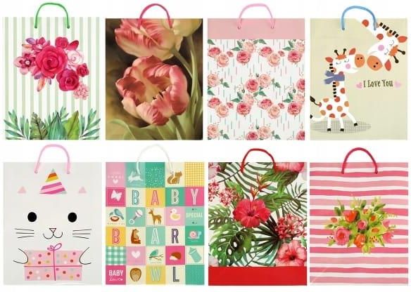 RAVI Torebka prezentowa M mix wzorów wysyłany losowo Efektowna torebka, która doskonale nadaje się do eleganckiego zapakowania prezentów okolicznościowych. Produkt jest częścią bogatej kolekcji torebek prezentowych dostępnych w wielu rozmiarach i wzorach. Wymiary: 180x225x100 mm