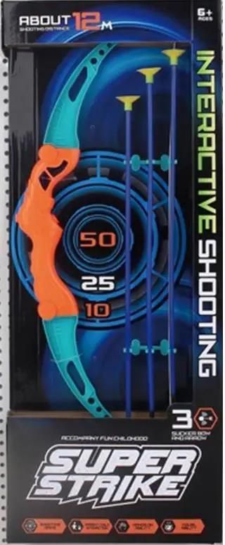 W zestawie: łuk dł. 50 cm, 3 strzały na przyssawki, funkcje: z opakowania można wyciąć tarczę i strzelać do niej strzałami, strzały na przyssawki przyczepiają się do płaskiej, gładkiej powierzchni, wym. Opak. 25,5 x 64 x 4,5 cm, 3+ Klasa: 3+ Oprawa: pudełko