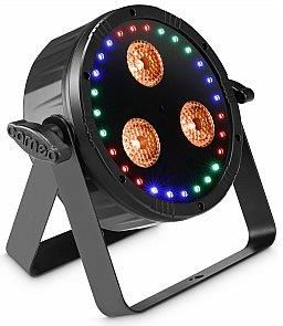 Cameo FLAT STAR – efekt LED 2 w 1Najważniejsze cechy: 3 x 12W RGBWA+UV LED dla bogatego mieszania kolorów i czarnego światła Pierścień złożony z 27 x 0,5W RGB SMD LED z wbudowanymi patternami dla stroboskopu oraz efektów Chase i Halo 5 trybów DMX oraz praca w trybie Master, Slave oraz Standalone …