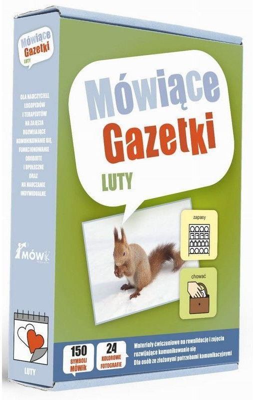 Mówiące gazetki. Luty - Mówik Materiały ćwiczeniowe na rewalidację i zajęcia rozwijające komunikowanie się dla osób ze złożonymi potrzebami komunikacyjnymi. Treści tematyczne miesiąca LUTY: Idzie luty Zwierzęta w okresie zimy Domy mieszkalne Odzież zimowa Teczka zawiera następujące elementy: 24 …