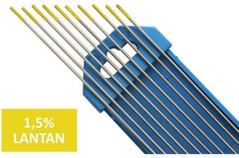 Elektrody wolframowe lantanowane (EWLa-1.5 wg klasyfikacji AWS) składają się z minimum 97,80 procent wolframu i 1,30 do 1,70 procent lantanu. Elektrody te charakteryzują się doskonałym zajarzeniem łuku, niskim zużyciem, dużą stabilnością łuku oraz doskonałym ponownym zajarzeniem. Rodzaj prądu: AC/DC Typowe zakresy zastosowań: stale nisko i wysokostopowe stopy aluminium stopy magnezu stopy tytanu stopy niklu stopy miedzi Właściwości spawalnicze: bardzo dobre właściwości zapłonu i ponownego zapłonu znakomita w zakresie prądu wysokiego wysoka trwałość wysoka stabilność łuku spawalniczego wysoka jakość spawu zastępuje z powodzeniem elektrody typu WT