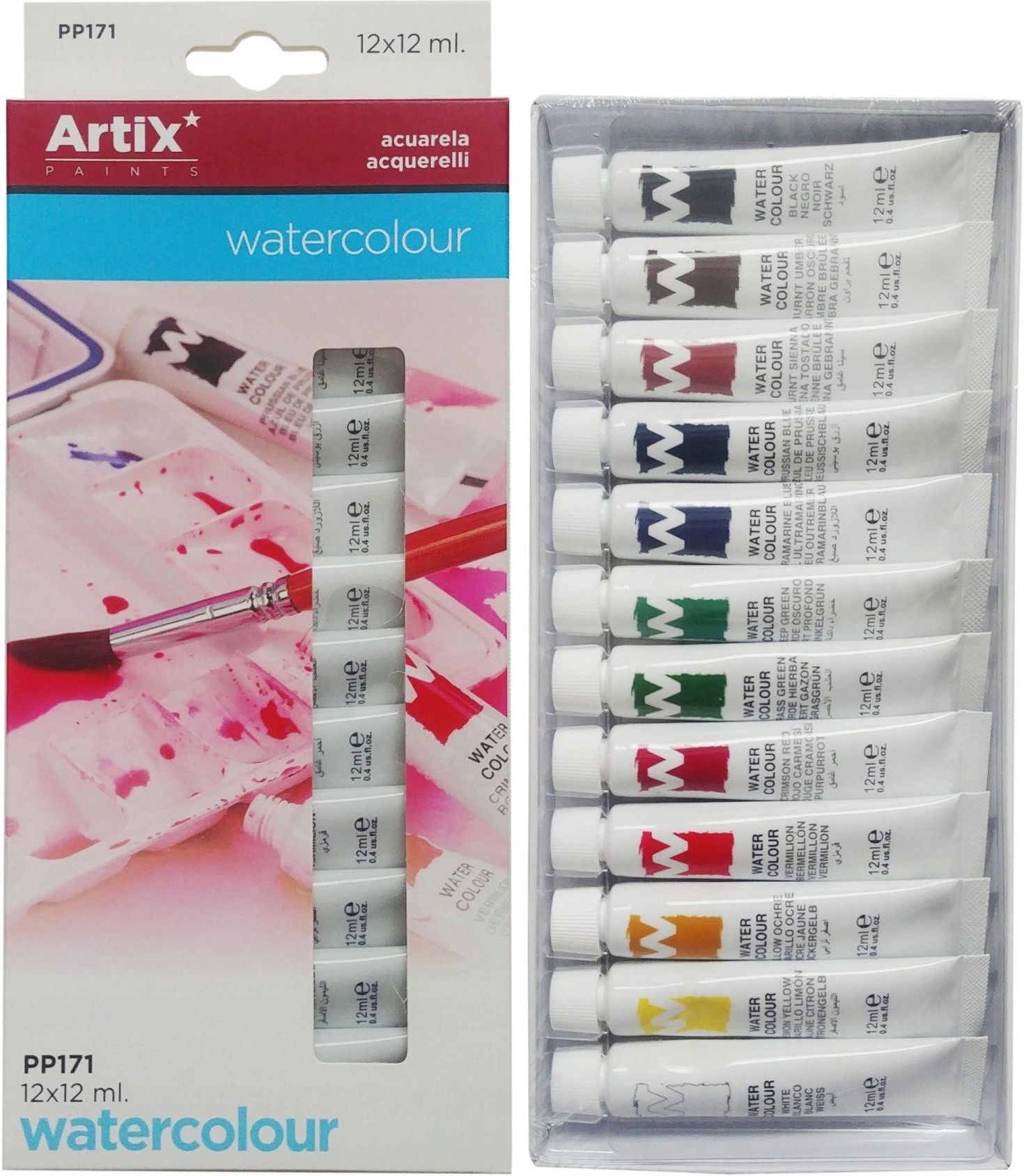 NAJWYŻSZEJ JAKOŚCI FARBY AKWARELOWE Zestaw 12 sztuk x 12 ml Wysoka jakość! Dobrze kryjące farby Trwałe, intensywne kolory Farby akwarelowe Artix są wszechstronne i charakteryzują się mocnymi i olśniewającymi kolorami, które można stosować na różnych podłożach. Farba jest dobrze napigmentowana, dzięki czemu pociągnięcie pędzla jest dobrze widoczne, ale można ją również mieszać z wodą, aby uzyskać bardziej przejrzystą pracę. Ze względu na krótki czas schnięcia możliwe jest malowanie różnych warstw na sobie. Wysoka światłotrwałość sprawia, że ​​prace bardzo długo zachowują swój oryginalny charakter.