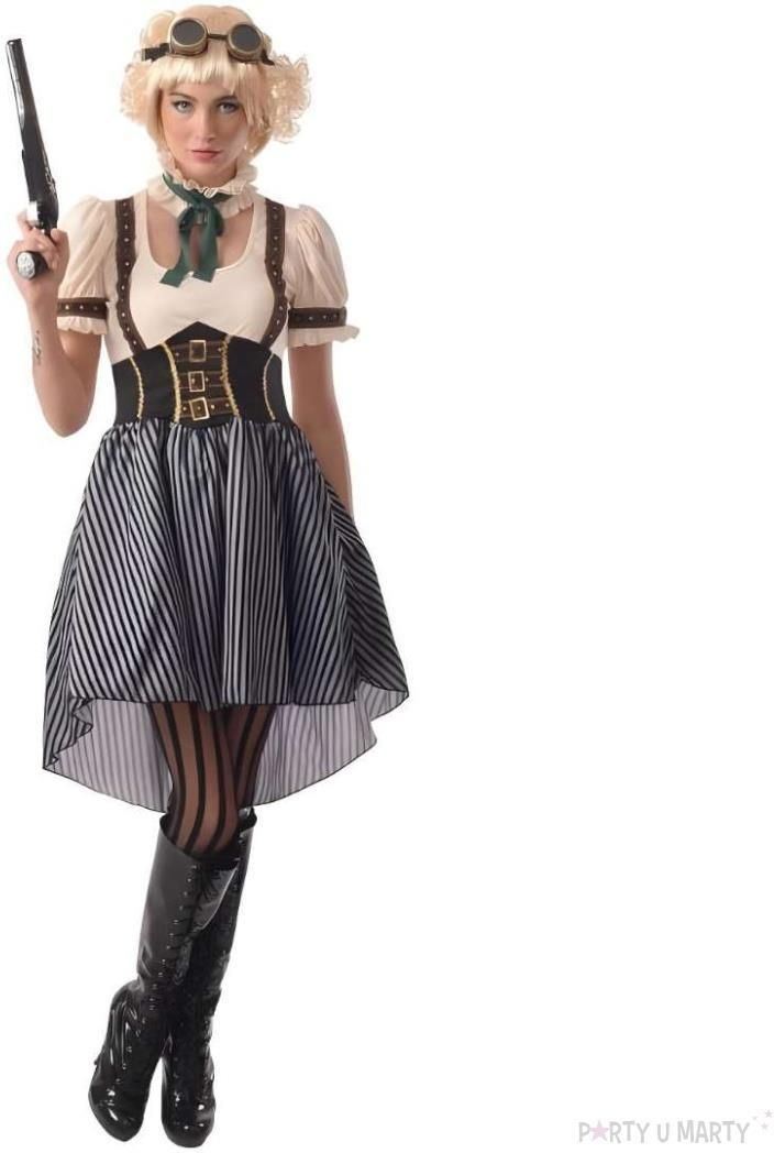 Kostium w stylu steampunk to doskonały wybór dla fanów retrofuturystycznej estetyki, łączącej modę wiktoriańską z elementami inspirowanymi epoką pary i maszyn. W skład zestawu wchodzą: Naszyjnik – delikatny, ozdobny naszyjnik z zieloną wstążką, który dodaje kostiumowi elegancji i nawiązuje do wiktoriańskiego stylu. Jest to subtelny, ale ważny element podkreślający kobiecy i stylowy charakter stroju. Okulary – klasyczne steampunkowe okulary w formie gogli, noszone na głowie. Są one wykonane z metalicznych materiałów, a ich wygląd nawiązuje do wynalazków z epoki pary, co nadaje kostiumowi futurystyczno-retro charakter. Sukienka – krótka, asymetryczna sukienka o kroju inspirowanym modą wiktoriańską, z dopasowanym gorsetem oraz rozkloszowaną spódnicą w czarno-białe paski. Gorset zdobiony jest złotymi klamrami, które nawiązują do mechanicznej stylistyki steampunkowej. Rękawy sukienki są bufiaste, co nadaje jej klasycznego, romantycznego wyglądu, a asymetryczny dół sukienki podkreśla dynamikę stylizacji. Ten kostium jest idealny dla osób, które chcą połączyć elegancję i odrobinę mrocznego, mechanicznego klimatu. To świetna propozycja na steampunkowe imprezy, konwenty czy bale przebierańców.