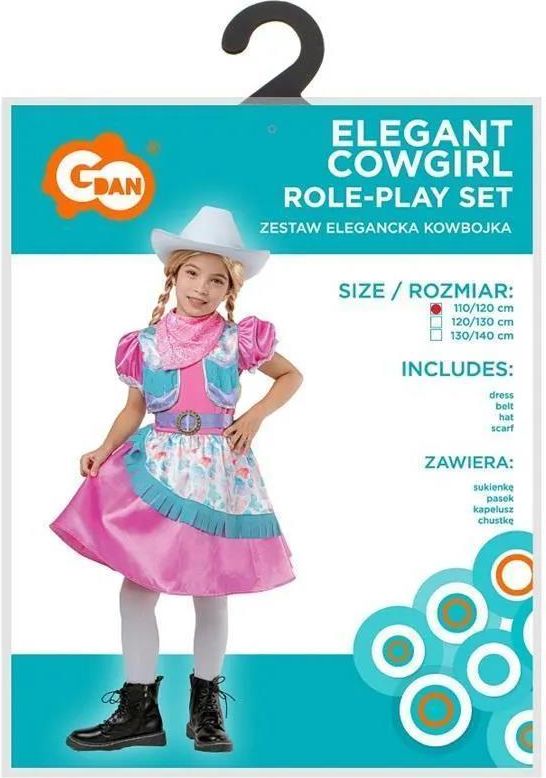 STRÓJ ELEGANCKA KOWBOJKA W skład stroju wchodzi: sukienka, pasek, kapelusz, chustka Rozmiar: 110/120 cm Kolor: różnokolorowy Materiał: 100% poliester Producent: Godan Format: 330x250 mm