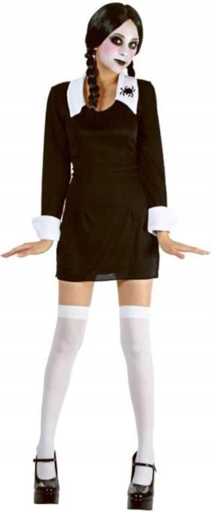 Ta czarna sukienka z białym kołnierzem i mankietami to stój inspirowany postacią Wednesday z głośnego hitu Netflixa. Świetnie się prezentuje i nada się na różne okazje od imprez okolicznościowych, tematycznych po przyjęcia Halloween. Strój sprawdzi się również, wtedy gdy całą rodziną postanowicie przebrać się za Adamsów i świętować Halloween. ▹ Uwaga! Zestaw zawiera tylko sukienkę. czarny,damski,doklejka CZARNE dekoracje,doklejka TOPY halloween,GoDan,Halloween,M,nie dotyczy,Rodzina Addamsów,Wednesday Addams