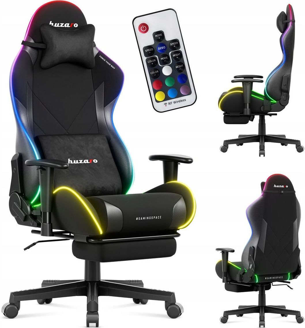 Fotel Gamingowy obrotowy z podświetleniem RGB i Podnóżkiem Huzaro Force 5.7 RGB Cechy szczególne Fotel gamingowy Force 5.7 Energooszczędne oświetlenie LED - dobry klimat w każdym miejscu Poduszka mięśni karku – komfortowe podparcie szyi i redukcja napięcia karku Ergonomiczne podłokietniki 2D – dopasowanie w pionie i poziomie Funkcja Gravity Duo 155° – odchylenie z blokadą Wysuwany podnóżek – wygodne podparcie nóg Poduszka lędźwiowa – pomaga utrzymać prawidłową postawę Styl gamingowy w klasie premium – wytrzymałe materiały i nowoczesny design Przyjemny w dotyku materiał Funkcja Grafity Duo - pochylenie oparcia do 155 Chwila przerwy? Odchyl oparcie i ustaw blokadę w ulubionej pozycji. Tryb pracy, chill albo szybka drzemka – wszystko w zasięgu jednego ruchu. Efektowne oświetlenie RGB Dynamiczne podświetlenie LED RGB zamienia zwykłe biurko w pole bitwy, a pokój w centrum dowodzenia. Twój fotel, Twój klimat, Twój styl. Energooszczędnie oświetlenie – ładowanie prosto z powerbanku. Wygodne sterowanie – za pomocą bezprzewodowego pilota. ProCore - zintegrowany zagłówek + poduszka szyjna Poduszka szyjna - zapomnij o sztywnym karku. Ergonomiczne oparcie z wbudowanym zagłówkiem i miękką poduszką gwarantuje pełne wsparcie podczas długich sesji i epickich maratonów gamingowych. Poduszka lędźwiowa - pełne wsparcie dla dolnego odcinka pleców – mniej bólu, więcej skupienia, 100% wygody. Podłokietniki 2D Regulacja wysokości 7 cm i ruch na boki (~18°) – idealne ustawienie pod klawiaturę, myszkę czy pada. Twoje ramiona i przedramiona będą zawsze w gotowości do akcji. Wysuwany podnóżek Wysuwasz, opierasz nogi i odpoczywasz jak król. Komfort na najwyższym poziomie, który poprawia krążenie i daje ulgę po długiej rozgrywce. Kółka bezpieczne dla podłóg Poliuretanowo-kauczukowe kółka 50 mm zapewniają płynne przemieszczanie się po różnych powierzchniach, nie niszcząc podłóg w biurze. Pewność w każdym detalu Certyfikat SGS potwierdza, że fotel został przetestowany pod kątem trwałości i ergonomii – dla Twojego codziennego komfortu. Specyfikacja Producent: Huzaro Model: Force 5.7 Konstrukcja: stalowa rama Materiał: oddychająca tkanina, materiał welurowy Wypełnienie:ekologiczna, gęsta i wytrzymała pianka Kółka: poliuretanowo-kauczukowe, 50 mm Siłownik: gazowy, 10 cm regulacji Podłokietniki: regulowane, 2D Maksymalny udźwig: 136 kg