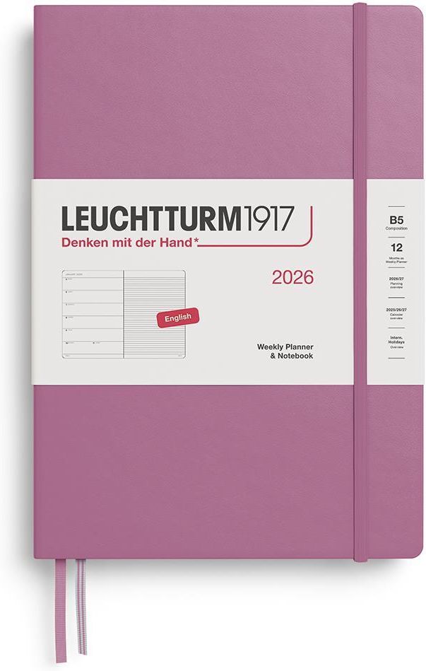 Planer tygodniowy Leuchtturm1917 na rok 2026, Composition B5 Planer tygodniowy Leuchtturm1917 w rozmiarze Composition B5 w kolorze Dusty Rose. Stworzony z myślą o tych, którzy cenią dobrą organizację i elegancję. Cały tydzień znajduje się na jednej stronie (7 dni na stronie), a obok dołączona jest dodatkowa strona na notatki – idealna na zadania, pomysły czy listy. Planer tygodniowy rozpoczyna się od stycznia 2026 i kończy na grudniu 2026 roku. Dodatkowo zawiera przegląd roku 2026, 2027 i 2028 i planer projektów. Przy datach umieszczono fazy księżyca i święta międzynarodowe. W twardej oprawie z rozkładaną kieszenią na notatki w okładce, dwoma wstążkowymi zakładkami dla lepszej organizacji i naklejkami do archiwizacji. Dodatkowe perforowane strony na notatki, pozwalające na czyste wyrwanie. Elastyczne zamknięcie. Szyty grzbiet umożliwiający wygodne, płaskie otwarcie. Bezkwasowy papier 80g/m2 doskonały do pisania piórem wiecznym. Rozmiar: Composition (B5) 178 x 254 mm