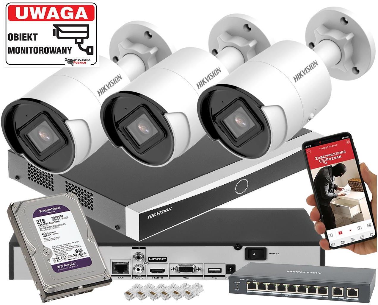 Zestaw monitoringu zawiera: 3x Kamera IP Hikvision DS-2CD2043G2-I 4 Mpx ACUSENSE, 1x Rejestrator IP DS-7608NXI-K1 na 8 kamer zPoE, 1x Switch PoE 8 portowy Hikvision DS-3E0310P-E/M, 1x Dysk do monitoringu HDD-WD20PURZ 2TB 24/7 WESTERN DIGITAL, 6x Wtyk RJ-45, 1x Tabliczka informacyjna