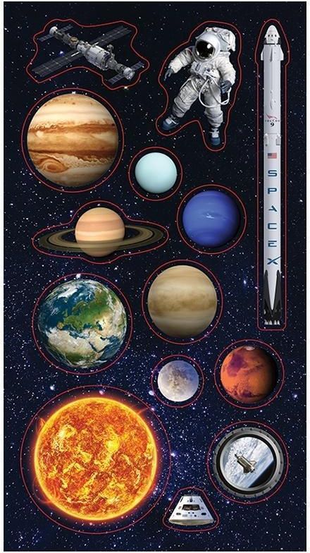 Zestaw naklejek do ozdoby zeszytów, albumów, listów, pocztówek - 14 kosmicznych obiektów. Wymiary: 150x80x20 mm Grupa wiekowa: 3+ Opakowanie: folia