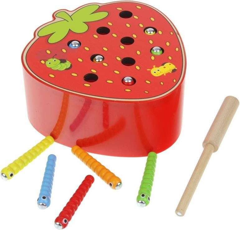 GRA DREWNIANA - TRUSKAWKA - ZŁAP ROBACZKA Zasady gry nie są zbyt skomplikowane i polegają na zapełnieniu owocu truskawki 10 robaczkami. W następnej kolejności dajemy dziecku które przy użyciu pałeczki z magnesem, wyciąga robaczki i w ten sposób pozbywamy się szkodników z owocu. Gra pomaga …