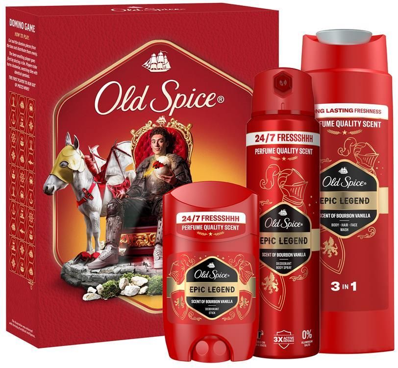 Old Spice Epic Legend Knight Zestaw Prezentowy dla Mężczyzn (Dezodorant w sztyfcie 50 ml + Dezodorant w sprayu 150 ml + Żel pod prysznic 250 ml) Wkrocz w świat legend, odwagi i niezapomnianych zapachów z zestawem Old Spice Epic Legend Knight Xmass! Ten wyjątkowy komplet to idealny prezent dla mężczyzny, który ceni siłę charakteru, poczucie humoru i nutę fantazji w codziennym życiu. Zestaw nie tylko zachwyca intensywnym zapachem, ale także oryginalnym opakowaniem w rycerskim stylu – z dodatkiem gry domino, którą możesz samodzielnie zbudować z pudełka. Zawartość zestawu Dezodorant w sztyfcie Old Spice Epic Legend 50 ml Wyjątkowy zapach dla prawdziwych legend! Skuteczna ochrona przed potem i nieprzyjemnym zapachem przez cały dzień. Nadaje się idealnie dla mężczyzn, którzy lubią zostawiać po sobie mocne wrażenie. Dezodorant w sprayu Old Spice Epic Legend 150 ml Dla tych, którzy lubią pachnieć epicko i świeżo przez długie godziny. Jego intensywny, męski aromat dodaje pewności siebie i energii – od pierwszego poranka do późnej nocy. Żel pod prysznic Old Spice Epic Legend 250 ml Zanurz się w świecie legendarnych zapachów! Oczyszcza, odświeża i pobudza zmysły, sprawiając, że każda kąpiel staje się epickim rytuałem. Dlaczego warto wybrać ten zestaw? Kompleksowa pielęgnacja dla mężczyzn o silnym charakterze. Kultowy, rozpoznawalny zapach Old Spice – intensywny, świeży i długotrwały. Oryginalne opakowanie z możliwością stworzenia gry domino – zabawa i prezent w jednym! Idealny pomysł na prezent dla fana fantasy, rycerskich klimatów lub po prostu mężczyzny z poczuciem humoru. Sposób użycia Stosuj każdy z produktów zgodnie z przeznaczeniem i odkryj, jak świeżość i siła mogą towarzyszyć Ci każdego dnia. Old Spice Epic Legend Knight – bo każda legenda zaczyna się od odważnego zapachu.