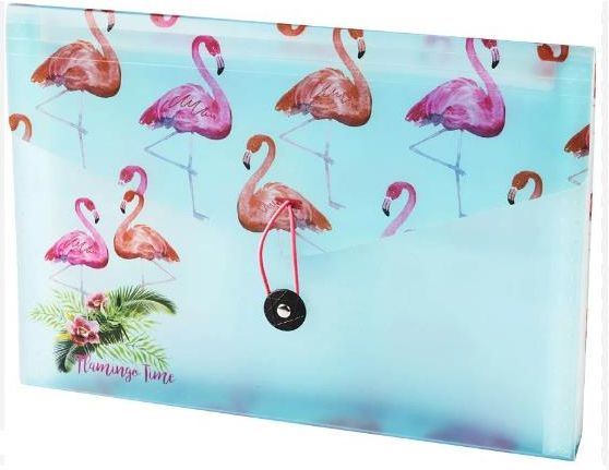 teczka harmonijkowa ozdobiona kolorowym motywem z wizerunkiem flamingów zamykana na uchwyt z gumką wewnątrz 12 przezroczystych przegródek na dokumenty możliwość opisania przegródek - załączone karteczki materiał: tworzywo sztuczne format: A4