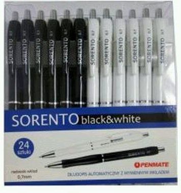 Długopis Sorento Black White - niezbędna część Twojego biura Długopis automatyczny Sorento Black White jest doskonałym narzędziem do codziennych zadań biurowych czy szkolnych. Wyposażony jest w wymienny wkład, co oznacza, że jego żywotność znacznie przewyższa standardowe długopisy. Został stworzony z myślą o wygodzie użytkowania, dlatego część chwytowa wyposażona jest w gumowe wkładki, aby pisanie nawet przez dłuższy czas nie męczyło Twojej ręki. Atrament, którym pisze długopis, cechuje się niską zawartością wiskozy, co przekłada się na lepszą płynność pisania i szybsze schnięcie.Dzięki swojemu ponadczasowemu kolorowi białemu i czarnemu, długopis Sorento Black White doskonale wpasuje się w estetykę każdego biura lub szkolnej ławki.Końcówka długopisu jest kulkowa o średnicy 0,7mm, co gwarantuje precyzyjne i wygodne pisanie.Nie zapominajmy, że w zestawie dostajesz aż 24 sztuki w jednym opakowaniu zbiorczym. To niewątpliwa wygoda, gdyż zawsze masz pod ręką zapas. EAN: 5906910816104
