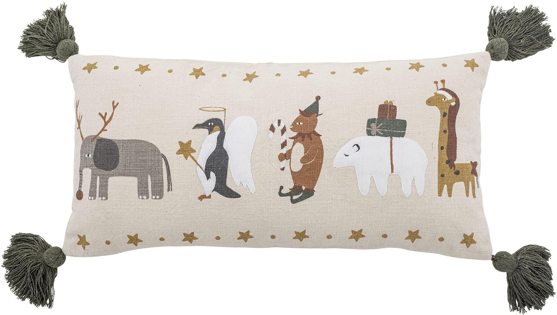 Poduszka Valentin od Bloomingville ze szlachetnej bawełny o fakturze lnu, ma przytulny wzór z uroczymi zwierzątkami, w świątecznej odsłonie. Wymiary: 60x30 cm Poszewka zapinana na zamek Materiał: bawełna Wkład w komplecie