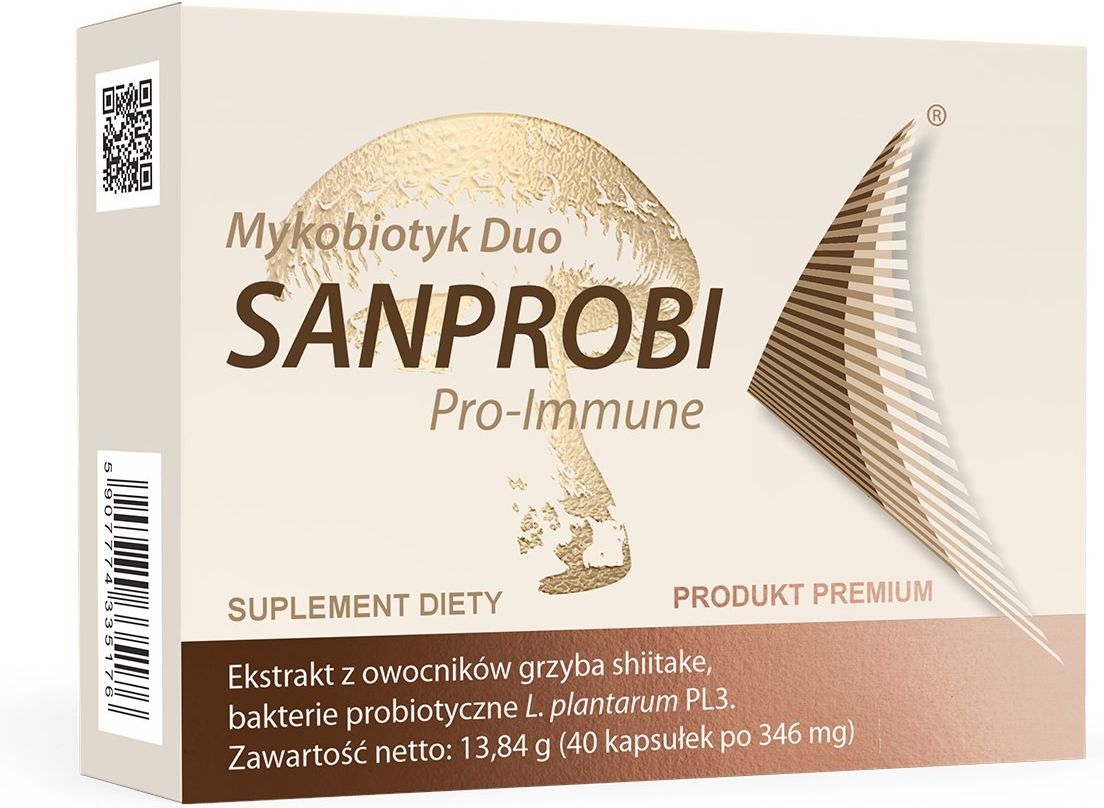 SANPROBI® Pro-Immune 40 kapsułek SANPROBI® Pro-Immune Mykobiotyk Duo SANPROBI® PRO-IMMUNE to suplement diety o unikalnym połączeniu grzybów oraz probiotyku, który uzupełnia codzienną dietę o bakterie probiotyczne L. plantarum PL3 – składnik mikrobioty jelitowej oraz polisacharydy i β-glukany grzyba shiitake. Substancje aktywne .tg {border-collapse:collapse;border-color:#93a1a1;border-spacing:0;} .tg td{background-color:#fdf6e3;border-color:#93a1a1;border-style:solid;border-width:1px;color:#002b36; font-family:Arial, sans-serif;font-size:14px;overflow:hidden;padding:10px 5px;word-break:normal;} .tg th{background-color:#657b83;border-color:#93a1a1;border-style:solid;border-width:1px;color:#fdf6e3; font-family:Arial, sans-serif;font-size:14px;font-weight:normal;overflow:hidden;padding:10px 5px;word-break:normal;} .tg .tg-cly1{text-align:left;vertical-align:middle} Składnik      1 kapsułka          2 kapsułki         Ekstrakt z owocników grzyba shiitake        250 mg        500 mg        o zawartości polisacharydów        75 mg        150 mg        i beta-1,3- i beta-1,6-D-glukanów        50 mg        100 mg        Całkowita liczba bakterii probiotycznych     Lactiplantibacillus plantarum PL3        0,5 × 10⁹ CFU*        1 × 10⁹ CFU*    *CFU – jednostki tworzące kolonię bakterii SANPROBI® Pro-Immune zawiera standaryzowany ekstrakt z owocników shiitake DER** 10:1. Jedna kapsułka SANPROBI® Pro-Immune zawiera 500 mg ekstraktu, co odpowiada około 5 g suszonych grzybów lub 50 g świeżych grzybów. W ekstrakcie z owocników shiitake występują m.in. lentinan, erytadenina oraz sterole i antyoksydanty. ** Wartość DER (ang. drug extract ratio) określa stosunek ilości surowca roślinnego do uzyskanego ekstraktu. Skład Ekstrakt z owocników grzyba shiitake (twardnik japoński, Lentinula edodes) DER 10:1; Lactiplantibacillus plantarum PL3, nośnik – celuloza mikrokrystaliczna; nośnik – sole magnezowe kwasów tłuszczowych; otoczka kapsułki: hydroksypropylometyloceluloza. Bakterie probiotyczne wchodzące w skład produktu zawierają mleko i produkty pochodne (łącznie z laktozą). Zalecane spożycie SANPROBI® Pro-Immune Zaleca się przyjmowanie 1 kapsułki dwa razy dziennie – rano i wieczorem – popijając szklanką wody. Ważne informacje o SANPROBI® Pro-Immune Produkt nie jest przeznaczony dla kobiet w ciąży lub karmiących piersią oraz dzieci poniżej 18 roku życia. Nie należy przekraczać zalecanej porcji do spożycia w ciągu dnia. Suplement diety nie może być stosowany jako substytut zróżnicowanej diety. Stosowanie produktu nie zwalnia od przestrzegania zasad zdrowego stylu życia (umiarkowanego wysiłku fizycznego i diety). Nie stosować w przypadku nadwrażliwości lub alergii na którykolwiek składnik produktu. Jeśli przyjmujesz leki, przed rozpoczęciem suplementacji skonsultuj się z lekarzem lub farmaceutą. Przechowywać w temperaturze pokojowej, nieprzekraczającej 25°C, w miejscu niedostępnym dla dzieci.