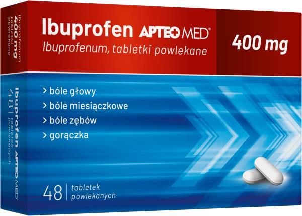 Opis produktu Ibuprofen APTEO MED zawiera 400 mg ibuprofenu, który należy do grupy leków zwanych niesteroidowymi lekami przeciwzapalnymi (NLPZ) zmniejszających ból i gorączkę. Lek ten stosowany jest w krótkotrwałym leczeniu objawowym bólu o małym lub umiarkowanym nasileniu, takiego jak ból głowy, bóle miesiączkowe, ból zębów oraz gorączki. Ibuprofen APTEO MED w dawce 400 mg jest przeznaczony dla osób dorosłych i młodzieży o masie ciała 40 kg i większej (w wieku 12 lat i powyżej). Skład Każda tabletka powlekana zawiera 400 mg ibuprofenu. Pozostałe składniki to: Rdzeń tabletki: laktoza jednowodna, skrobia kukurydziana, hypromeloza, krzemionka koloidalna bezwodna, celuloza mikrokrystaliczna, kroskarmeloza sodowa, magnezu stearynian Otoczka tabletki: Opadry White 03G28692:hypromeloza, tytanu dwutlenek (E171), makrogol 6000, makrogol 400 Wskazania Krótkotrwałe leczenie objawowe bólu o nasileniu małym do umiarkowanego, takiego jak ból głowy, ból miesiączkowy, ból zębów oraz gorączka. Jeśli po upływie 3 dni w przypadku leczenia gorączki i 4 dni w przypadku leczenia bólu nie nastąpiła poprawa lub pacjent czuje się gorzej, należy zwrócić się do lekarza. Substancja czynna: Ibuprofenum Dawkowanie Dorośli i młodzież o masie ciała ≥40 kg (w wieku 12 lat i powyżej): Należy przyjmować 1 tabletkę (200 mg do 400mg ibuprofenu),popijając szklanką wody, maksymalnie do 3 razy na dobę, w razie konieczności. Nie przyjmować częściej niż co 6 godzin. Nie przyjmować więcej niż 1200 mg ibuprofenu na dobę. Leku nie podawać młodzieży o masie ciała poniżej 40 kg lub dzieciom w wieku poniżej 12 lat. Przeciwwskazania jeśli pacjent ma uczulenie na ibuprofen lub którykolwiek z pozostałych składników tego leku, jeśli u pacjenta wystąpiły trudności w oddychaniu, astma, katar, obrzęk lub pokrzywka po zastosowaniu kwasu acetylosalicylowego (aspiryna) lub innych podobnych leków przeciwbólowych (NLPZ), jeśli u pacjenta występuje choroba wrzodowa żołądka (lub kiedykolwiek wystąpiły dwa lub więcej przypadki choroby wrzodowej) lub krwawienie z żołądka, jeśli u pacjenta w przeszłości występowało krwawienie lub perforacja przewodu pokarmowego po zastosowaniu NLPZ, jeśli pacjent ma ciężką niewydolność nerek, serca lub wątroby, jeśli u pacjenta występują krwawienia, w tym krwawienia w obrębie mózgu (krwawienie z naczyń mózgowych), jeśli u pacjenta występują niewyjaśnione zaburzenia układu krwiotwórczego, u pacjentów ze znacznym odwodnieniem (spowodowanym wymiotami, biegunką lub niewystarczającym spożyciem płynów), u pacjentek w ostatnim trymestrze ciąży.