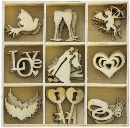 Pudełko kreatywne z elementami wykonanymi z drewna, to doskonałe narzędzie dekoracyjne dla kartek okolicznościowych, prezentów, prac artystycznych i wszędzie tam gdzie nas wyobraźnia poniesie. Gwarantowana zabawa dla dużych i małych. Opakowanie zawiera 45 elementów dekoracyjnych w 9 wzorach o motywie ślubnym.