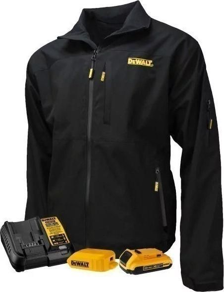 Akumulatorowa kurtka podgrzewana 18V XR, rozmiar M, DeWalt [DCHJ090BD1-M]: ogrzewana kurtka robocza typu softshell zapewnia ciepło na wiele godzin, posiada 3 strefy grzewcze - 1 na plecach i 2 z przodu, ma możliwość 3-stopniowej regulacji ciepła, materiał zewnętrzny jest wiatroszczelny i wodoodporny, co w połączeniu z miękką podszewką z polaru stanowi wygodną i ciepłą opcję na chłodniejsze dni, liczne kieszenie (kieszeń na telefon komórkowy, 2 dolne kieszenie na zamek błyskawiczny, kieszeń na rękawie z suwakiem, wewnętrzna kieszeń na piersi i dolna kieszeń na akcesoria oraz tylna kieszeń na baterie) sprawiają, że kurtka ta jest wielofunkcyjna i stanowi wygodną odzież nie tylko do pracy, ale także pozwala mieć najpotrzebniejsze narzędzia ręczne pod ręką, dół kurtki można ściągnąć, aby zapewnić sobie ochronę przed wiatrem, dodatkowe mankiety z tkaniny ściągaczowej pomagają utrzymać ciepło wewnątrz kurtki, wszystkie zamki w kurtce są wodoodporne, kurtki akumulatorowe nie mogą być noszone przez osoby z rozrusznikiem serca, kurtka dostarczana jest z akumulatorem, ładowarką i adapterem umożliwiającym ładowanie urządzeń mobilnych (np. telefonu) za pomocą kabla USB. Parametry techniczne podgrzewanej kurtki DeWalt [DCHJ090BD1-M]: napięcie zasilania: 18V XR, typ akumulatorów: Li-Ion, pojemność akumulatora: 2,0 Ah, materiał: poliester, kieszeń na akumulator: tak, kolor: czarny, kształt kołnierza: ze stójką, rozmiar: M Wyposażenie kurtki DeWalt [DCHJ090BD1-M]: akumulator 18V XR / 2,0 Ah, adapter USB do akumulatora [DCB092], ładowarka wielonapięciowa [DCB107], instrukcja obsługi.
