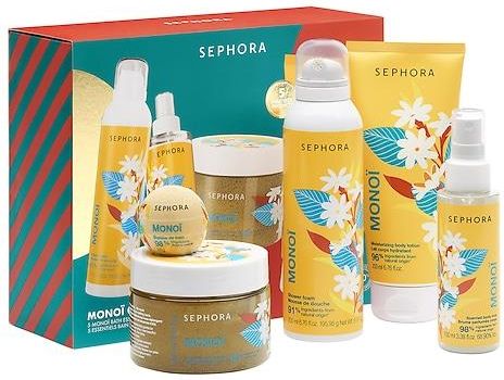 Podaruj bliskim chwilę relaksu dzięki temu zestawowi upominkowemu do kąpieli o zapachu monoi. Zestaw prezentowy do kąpieli: pełnia egzotyki na świętaZestaw do kąpieli Sephora Collection zawiera 5 niezbędnych produktów zapewniających skórze miękkość, nawilżenie i delikatny zapach. Myj, złuszczaj, nawilżaj i zmieniaj swoją kąpiel w egzotyczną przygodę dzięki formułom zawierającym ponad 90% składników pochodzenia naturalnego. Duży rozmiar dla maksymalnej przyjemnościJaka jest największa zaleta tego zestawu prezentowego o zapachu monoi? Łączy wyłącznie produkty o standardowych rozmiarach, aby cieszyć się nimi dłużej. Świąteczne opakowanie w pomarańczowym, zielonym i złotym kolorze sprawia, że jest to idealny prezent pod choinkę. Elegancki i pachnący sposób, aby sprawić przyjemność bliskiej osobie i okazać jej swoje uczucia. Zalety zestawu prezentowego o zapachu monoi SEPHORA COLLECTION-Tylko standardowe rozmiary. Kultowy zapach monoi z kolekcji SEPHORA. Ponad 90% składników pochodzenia naturalnego. Pomysł na niedrogi kobiecy prezent na święta. Opakowanie wykonane z kartonu wyprodukowanego z drewna pochodzącego z lasów zarządzanych w zrównoważony sposób. Szacowana łączna wartość = suma cen poszczególnych produktów wchodzących w skład zestawu, sprzedawanych osobno w Sephorze. Oferta obowiązuje do wyczerpania zapasów.