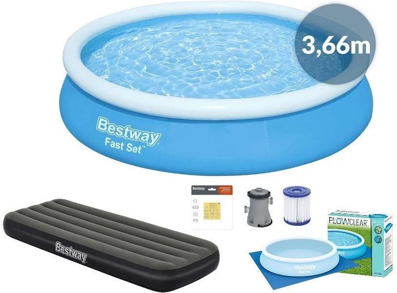 Zestaw basenowy Aqua Oasis 3.66x76cm - BESTWAY - OpisOdkryj doskonały zestaw Bestway Aqua Oasis, który zapewni Ci niezapomniane chwile pełne radości i relaksu podczas letnich dni. Ten kompletny zestaw zawiera wszystko, czego potrzebujesz, aby cieszyć się wodnymi przyjemnościami na najwyższym poziomie. Składający się z przestronnego, okrągłego basenu nadmuchanego, zaopatrzonego w zaawansowaną pompę filtrującą z wkładem, płachtę pod basen, wygodny Materac Tritech Air Mattress Jr Twins o wymiarach 1.85x0.76m oraz podwodne łatki naprawcze, zestaw ten idealnie sprawdzi się w Twoim ogrodzie, dostarczając niezapomnianych wrażeń i wyjątkowego komfortu. Zapomnij o troskach i skup się na radości i relaksie, korzystając z tego kompletnego zestawu. Aqua Oasis to doskonałe miejsce do zabawy i wypoczynku dla całej rodziny. Pozwól swoim najbliższym cieszyć się chwilami beztroskiej radości i ochłody w tym przepięknym basenie, a wygodny materac zapewni dodatkowy komfort podczas kąpieli. W skład zestawu wchodzi: Okrągły basen nadmuchiwany - 3.66m x 76cm - To wspaniałe miejsce do zabawy i relaksu dla całej rodziny. Pozwól swoim najbliższym cieszyć się chwilami beztroskiej radości i ochłody w tym przepięknym basenie. Wybierz Fast Set, by tworzyć niezapomniane wspomnienia w przyjemnej atmosferze wodnej zabawy. Wyjątkowy komfort, wytrzymała konstrukcja i łatwość użytkowania tego basenu sprawią, że każdy dzień spędzony w wodzie będzie wyjątkowy i pełen wesołych chwil. Zalety tego basenu sprawią, że wszystkie uciechy wodne staną się jeszcze bardziej przyjemne, a radosne kąpiele będą doskonałą okazją do wspólnego spędzenia czasu z bliskimi. Wybierz Fast Set i ciesz się letnimi przyjemnościami w najlepszym stylu! Pompa filtrująca z niezbędnymi akcesoriami -Odkryj łatwość i efektywność tej pompy już dziś! Skorzystaj z jej nieocenionych zalet, by zapewnić sobie i swoim bliskim czystą i bezpieczną wodę w basenie, ciesząc się kąpielami bez żadnych obaw. Wybierz tę niezawodną pompę do filtracji wody, która zapewni Ci spokój i komfort podczas wodnych przyjemności. W komplecie z pompą znajdziesz wszystkie niezbędne akcesoria, które umożliwią prawidłowe podłączenie i sprawne działanie pompy. Dzięki tej pompie do filtracji wody, utrzymanie krystalicznie czystego basenu będzie proste i przyjemne, pozwalając Ci cieszyć się kąpielami bez żadnych obaw. Niezależnie od tego, czy jesteś doświadczonym użytkownikiem, czy dopiero zaczynasz przygodę z basenem, ta pompa do filtracji wody spełni Twoje oczekiwania. Wkład filtrujący do pompy - Dzięki wkładom filtrującym Bestway typu I, możesz być pewien, że Twoja woda zawsze będzie klarowna i gotowa do przyjemnych kąpieli. Wykorzystaj ich niezawodność i ciesz się bezpiecznym oraz relaksującym czasem spędzonym w swoim basenie. To proste i skuteczne rozwiązanie, które pozwoli Ci skupić się na przyjemności korzystania z basenu, bez konieczności martwienia się o jakość wody. Dbając o wygodę użytkowania, wkłady są łatwe w czyszczeniu, co pozwala utrzymać je w doskonałej kondycji. Bestway zaleca regularną wymianę tych wkładów co 2 tygodnie, aby uzyskać najlepsze rezultaty i cieszyć się krystalicznie czystą wodą przez cały sezon. Mata ochronna pod basen - Zaufaj Tkaninie Bestway Ground Cloth, aby zapewnić swojemu basenowi solidną ochronę oraz długą żywotność. To niezbędne akcesorium, które dba o Twój komfort i zadowolenie podczas letniej przyjemności w basenie! Dodatkową zaletą tej tkaniny jest to, że jeśli woda rozleje się z basenu, zbiera się na powierzchni tkaniny, co uniemożliwia zapadnięcie się w błocie po wyjściu z basenu. Dzięki temu nie tylko chroni trawnik przed uszkodzeniem, ale także pozwala zachować czystość wokół basenu, eliminując nieprzyjemne błotniste kałuże. Twój basen pozostaje w odpowiednich warunkach, a Twoje otoczenie jest estetyczne i bezpieczne. Materac Tritech Air Mattress Jr Twins 1.85x0.76m - Materac dmuchany Bestway TRITECH AIRBED TWIN to wygodna i praktyczna opcja dla osób, które często korzystają z namiotów podczas biwaków lub potrzebują dodatkowego miejsca do spania dla niespodziewanych gości. Ten materac dmuchany zapewnia komfortowy sen i jest łatwy w użyciu, dzięki załączonej pompce, która umożliwia szybkie dmuchanie i opróżnianie. Jego wymiary 79 cm szerokości, 185 cm długości i 25 cm wysokości sprawiają, że jest wystarczająco duży, aby zapewnić wygodę podczas snu, a jednocześnie nie zajmuje zbyt dużo miejsca. Wysokość 25 cm jest również odpowiednia do miejsc, gdzie materace dmuchane mogą być trudne do użycia, takie jak namioty czy pokoje gościnne. Podwodne Łatki Naprawcze 42.3cm kw. (Opakowanie 10 sztuk) - Wybierz podwodne łatki naprawcze, by zapewnić sobie spokój i bezpieczeństwo podczas korzystania z basenu, wiedząc, że jesteś odpowiednio przygotowany na ewentualne sytuacje. To niezawodny dodatek, który pozwoli Ci cieszyć się basenem przez cały sezon bez obaw o uszkodzenia. Cechy produktu Ściany boczne DuraPlus odporne na przebicie i promieniowanie UV są odporne na ciężar, odks