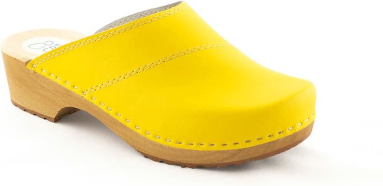 chodaki wyprofilowane ortopedycznie, drewo topola, guma antypoślizgowa, skóra bydlęca kolor żółty. Czubek wyprofilowany-antycellulitowe