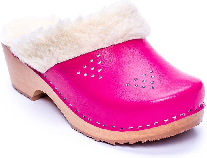Chodaki z ocieplaczem, drewno topola, skóra bydleca kolor rózowy. Wyrób recznie robiony