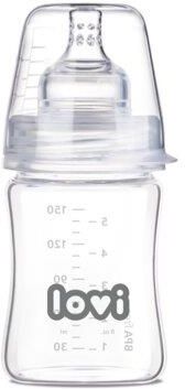 Butelka szklana LOVI jest wyposażona w smoczek dynamiczny, który nie zaburza naturalnego odruchu ssania, gdyż mobilizuje mięśnie jamy ustnej dziecka do aktywnej, wytężonej pracy. Antykolkowy system odpowietrzania zapobiega zasysaniu i zapadaniu się smoczka, zmniejszając ryzyko wystąpienia kolki.