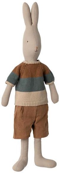 Króliczek, Rabbit size 4, Classic - Knitted shirt and short Uroczy królik Maileg ze stojącymi uszkami w bluzeczce w paski i krótkich spodenkach. Króliczek może być wspaniałą przytulanką lub kolejnym członkiem króliczej rodzinki. Rewelacyjny towarzysz zabaw oraz oryginalny element wystroju pokoju dziecięcego. Zabawki Maileg są wykonane z naturalnych, bezpiecznych materiałów a niezwykły design pobudza wyobraźnię i zachęca dzieci do wspólnej zabawy. Szczegółowy opis Wysokość: 62 cm Pielęgnacja: prać w temperaturze 30° C Materiały: len, bawełna Produkt zgodny z normą CE