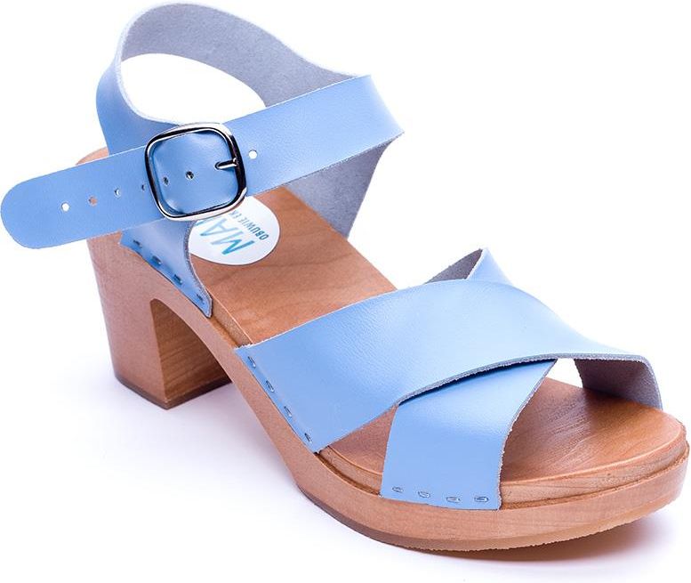 Sandały na koreczku o wysokości 7.5 cm drewno topola, lakierowane, podbite gumką antypoślizgową. Skóra bydlęca kolor błekitny