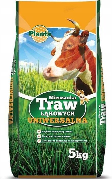 TRAWA ŁĄKOWA UNIWERSALNA B-2 BEZ MOTYLKOWYCH waga: 5 kg uniwersalna mieszanka traw łąkowych B-2 - bez roślin motylkowych dobrana według potrzeb hodowlanych i polskich warunków klimatycznych szybki i intensywny odrost soczysta i pożywna pasza zwiększona odporność na wydeptywanie doskonale znosi przykaszanie i może być wykorzystywana na siano mieszanka posiada świadectwo kwalifikacji nasion wydane przez Państwową Inspekcję Ochrony Roślin i Nasiennictwa opakowanie: torba foliowa 5 kg norma siewu: 35-40 kg / 1 ha Skład mieszanki (może się nieznacznie różnić w zależności od przygotowanej partii): Życica trwała (Lolium perenne): 25% Życica wielokwiatowa (Lolium multiflorum): 25% Życica westerwoldzka (Lolium westerwoldicum): 10% Życica mieszańcowa (Lolium ×boucheanum): 10% Kostrzewa czerwona (Festuca rubra): 10% Kostrzewa łąkowa (Festuca pratensis): 10% Tymotka łąkowa (Phleum pratense): 10%