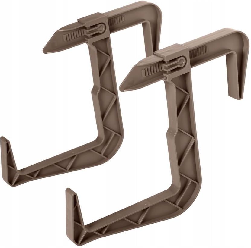 Uchwyty do doniczki balkonowej beż Dwa solidne uchwyty doniczki balkonowej . Wykonane z mocnego tworzywa sztucznego uchwyty do skrzynek balkonowych. Uchwyty posiadają regulacje, z łatwością można dopasować je do różnych rodzajów balustrad i poręczy. Dwa wieszaki wystarczają do doniczek nie przekraczających 80 cm długości. Wytrzymują wysokie temperatury, jak i kilkunastostopniowe mrozy. Wymiary: długość 22,7cm szerokość 19,7cm wysokość 2,5cm Regulowana szerokość montażu na poręcz od 1cm do 9,5cm. Wielkość doniczki jaka zmieści się w uchwycie to 14cm x 16cm. Komplet 2 sztuki. Kolor beżowy. Materiał - tworzywo sztuczne.