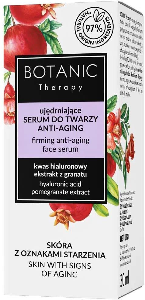 Botanic ujędrniające serum do twarzy anti-aging z kwasem hialuronowym i ekstraktem z granatu – skóra z oznakami starzeniaBOTANIC Therapy to kosmetyki będące naturalną terapią dla Twojej skóry. Codzienna pielęgnacja przy użyciu produktów marki to nie tylko sposób na zadbanie o kondycję skóry, ale także o wewnętrzne potrzeby - odpoczynku, spełnienia, relaksacji. Technolodzy BOTANIC, starając się sprostać potrzebie self-care, połączyli cenne składniki superfood ze składnikami aktywnymi, dając bogate receptury, które stanowią nie tylko odżywczy pokarm dla skóry, ale także dla zmysłów.Ujędrniające serum do twarzy anti-agingReceptura serum stanowi naturalną terapię dla Twojej zmęczonej, pozbawionej sprężystości skóry. Dzięki połączeniu ekstraktu z granatu, aloesu wraz z nisko i wysokocząsteczkowym kwasem hialuronowym, intensywnie nawilża skórę. Działa ujędrniająco, wspomaga procesy regeneracji i poprawia wygląd skóry. Po użyciu Twoja cera jest odpowiednio nawilżona, uelastyczniona oraz wygładzona.Sposób użyciaNiewielką ilość serum nanieś na oczyszczoną skórę twarzy, szyi i dekoltu. Stosuj codziennie rano i wieczorem. Dopełnij terapię swojej skóry! Najlepiej stosuj w połączeniu z Regenerującym kremem anti aging BOTANIC Therapy.Produkt przebadany dermatologicznie.97% składników pochodzenia naturalnego.Zmiana barwy produktu uwarunkowana jest wysoką zawartością składników pochodzenia naturalnego.Działanie składników naturalnych i aktywnych KWAS HIALURONOWY NISKO I WYSOKOCZĄSTECZKOWY dzięki silnym właściwościom higroskopijnym intensywnie nawilża skórę, poprawia jej elastyczność i jędrność. EKSTRAKT Z GRANATU posiada właściowości antyoksydacyjne i wygładzające. ALOES działa kojąco oraz regenerująco.