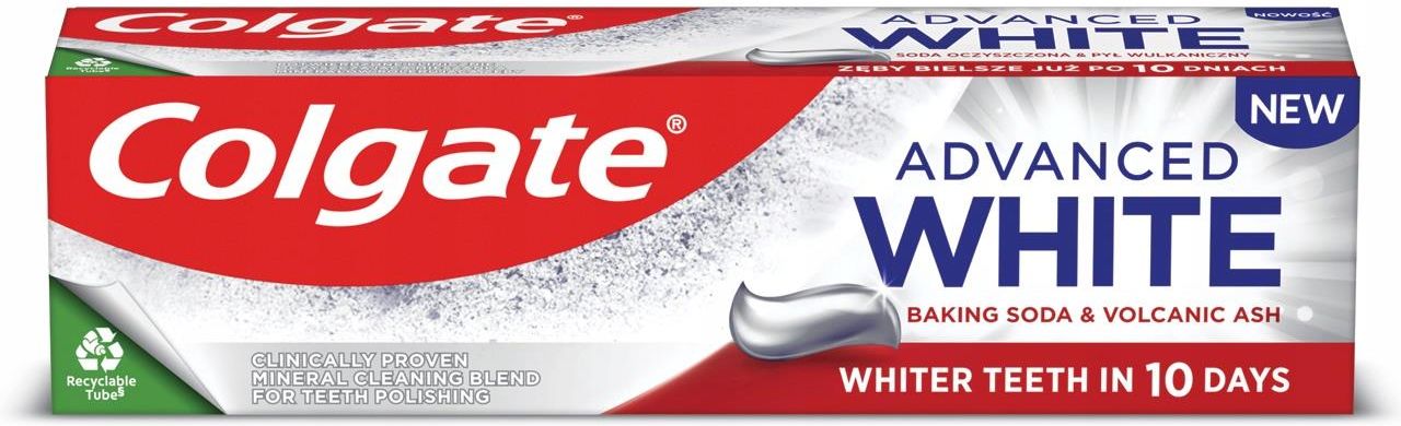 Wybielająca pasta do zębów COLGATE ADVANCED WHITE Soda Oczyszczona & Pył wulkaniczny - 75 ml Pasta Colgate Advanced White Soda Oczyszczona & Pył wulkaniczny pomaga usuwać przebarwienia powierzchniowe przywracając naturalną biel zębów w 10 dni, co zostało potwierdzone klinicznie.  …
