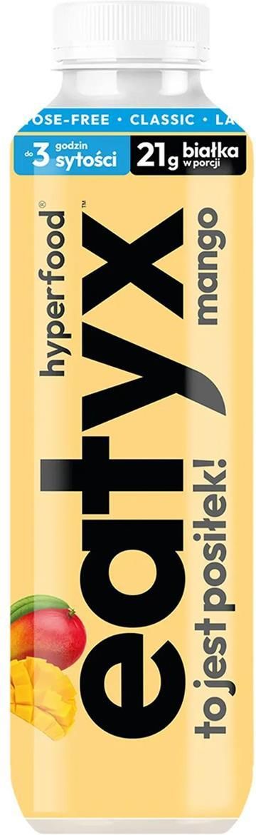 Eatyx Gotowy Kompletny Posiłek do Picia w Płynie Mango lactose free 300 m Nasz kompletny posiłek w płynie o smaku mango to doskonałe rozwiązanie dla osób szukających zdrowego, szybkiego i wygodnego sposobu na zaspokojenie głodu. Dzięki zbilansowanej formule wzbogaconej o 21 witamin i minerałów, eatyx dostarcza Twojemu organizmowi wszystkiego, co niezbędne do funkcjonowania na najwyższym poziomie. To pełnowartościowy posiłek, który może zastąpić śniadanie, obiad lub kolację, a praktyczne opakowanie 300 ml sprawia, że idealnie sprawdzi się w pracy, podróży czy w szkole. Bez potrzeby przygotowania, gotowy do spożycia produkt zadba o Twoje zdrowie i wygodę. Dzięki smukłej i poręcznej butelce, eatyx Hyperfood Mango łatwo zmieści się w torbie, plecaku czy nawet małej torebce. Dodatkowo precyzyjnie skomponowana mieszanka składników ułatwi kontrolę wagi oraz pomoże utrzymać zdrową sylwetkę. Aksamitna konsystencja i tropikalny smak mango sprawiają, że każda porcja to wyjątkowe doświadczenie kulinarne, które zachwyci Twoje podniebienie. Dlaczego warto wybrać eatyx Hyperfood Mango 300 ml? Bezlaktozowa i bezglutenowa receptura na bazie białek mleka. Zbilansowana mieszanka 21 witamin i minerałów, w tym witaminy D, B12, cynku i wapnia, które wspierają układ odpornościowy i prawidłowe funkcjonowanie mięśni. Aksamitna, płynna konsystencja i wyrazisty, tropikalny smak mango, który zachwyci każdego miłośnika zdrowego odżywiania. Sytość nawet do 3 godzin – jedna porcja to pełnoprawny posiłek, gotowy do spożycia w każdej chwili. Bez konserwantów, bez dodatku cukru – zawiera jedynie naturalnie występujące cukry. 21 g białka w porcji, 303 kcal w 300 ml – posiłek idealny dla osób dbających o swoją wagę i sylwetkę. Pełnowartościowy posiłek w płynie mango 300 ml - dla kogo? Jeżeli: nie masz czasu na gotowanie, ale chcesz odżywiać się zdrowo, intensywnie trenujesz i zależy Ci na zbilansowanych posiłkach, szukasz zdrowych alternatyw podczas podróży, zależy Ci na kontroli wagi i utrzymaniu zdrowej sylwetki, unikasz glutenu, laktozy, cukru dodanego i konserwantów w diecie, to eatyx Hyperfood Mango spełni Twoje oczekiwania. Zapomnij o skomplikowanym planowaniu posiłków – teraz możesz jeść zdrowo i smacznie, bez dodatkowego wysiłku. Nasz produkt to idealna propozycja dla osób, które cenią sobie wygodę, zdrowie i innowacyjne podejście do odżywiania. Dzięki recepturze opartej na mleku bez laktozy, jest odpowiedni również dla osób z nietolerancją tego składnika. eatyx – Licz kalorie, dbaj o ciało.
