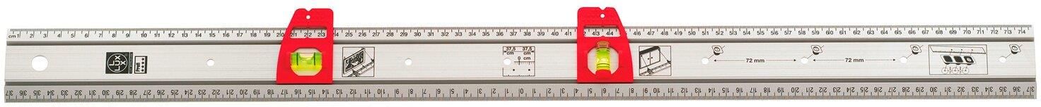 Przymiar liniowy LUX-TOOLS posiada dwie libelle (pionową i poziomą).Całkowita długość przymiaru wynosi 75 cm i jest podzielona w środku punktem zerowym na dwie podziałki od 0 cm do 37,5 cm odchodzące w lewo i w prawo od tego punktu.Przymiar jest niezastąpiony przy zawieszaniu obrazów, regałów lub luster. Dzięki dokładnemu wymiarowaniu otworów jest optymalnym narzędziem do zaznaczania na ścianach miejsc montażu gniazdek elektrycznych na kilka wtyczek oraz wyłączników.