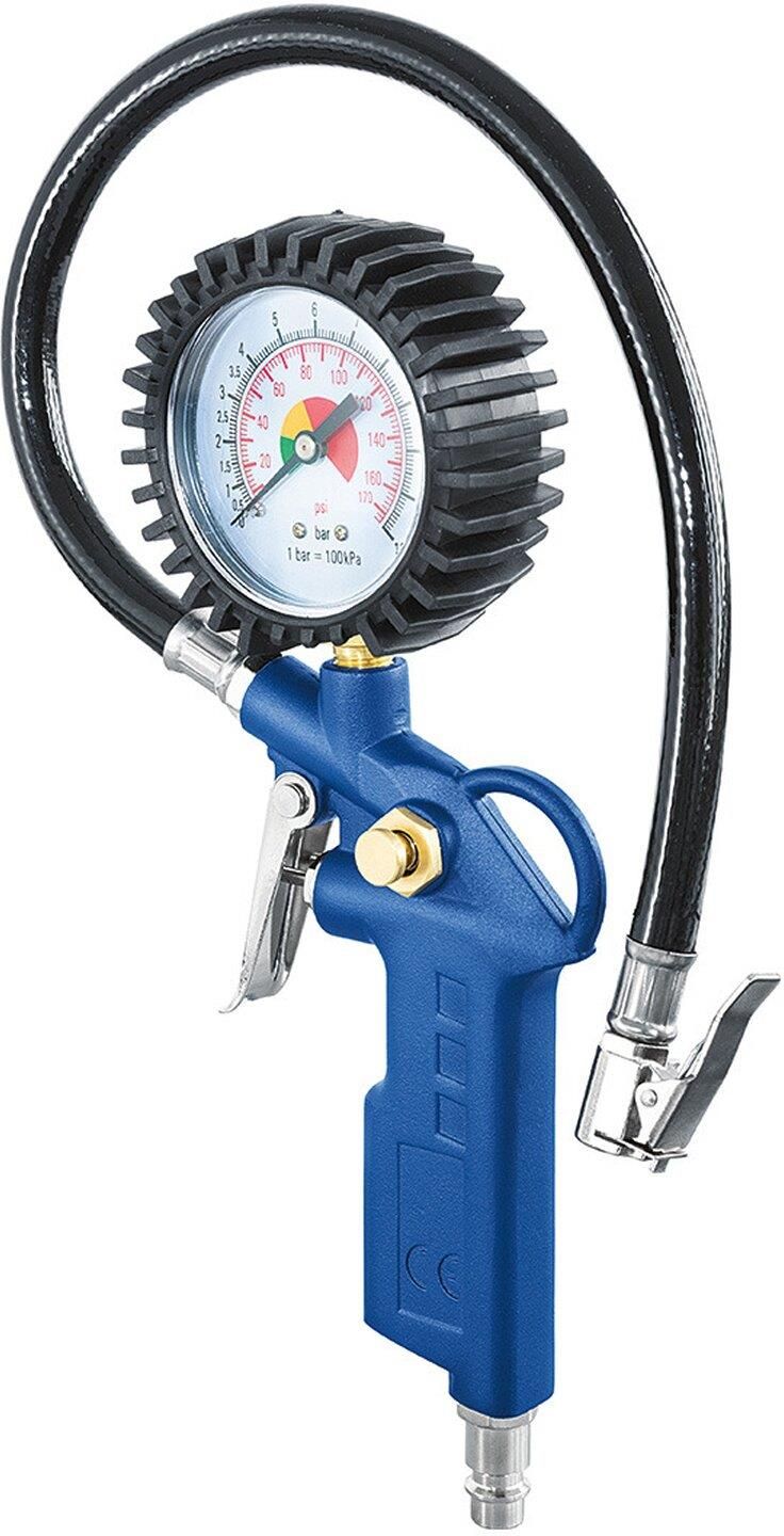 Pistolet z manometrem do pompowania i pomiaru ciśnienia w oponach w samochodzie czy też motocyklu. Pistolet mocowany do węża za pomocą szybkozłączki 1/4" Wskazuje pomiary w zakresie 0-12 bar.