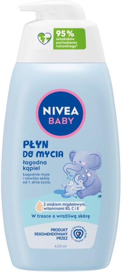NIVEA BABY Płyn do mycia łagodna kąpiel 450 ml Odkryj nowość od NIVEA BABY Płyn do mycia łagodna kąpiel, który nie tylko łagodnie myje, ale także pomaga utrzymać naturalne nawilżenie oraz chroni i wzmacnia skórę dziecka, wspierając jej naturalny proces rozwoju od 1. dnia życia. Zawiera w 100% naturalny olejek migdałowy i witaminy B5, C i E. Stworzony tak, aby minimalizować ryzyko alergii**. Produkt rekomendowany przez Instytut Centrum Zdrowia Matki Polki, a jego tolerancja dla delikatnej i wrażliwej skóry niemowląt i dzieci została potwierdzona dermatologicznie. Nasze nowe formuły są łagodne i dbają o delikatną skórę dziecka i naszą planetę. Formuła jest wegańska, biodegradowalna^ i nie zawiera mikroplastiku^^. ^formuła bez składników pochodzenia zwierzęcego, biodegradowalna w 99,8% ^^zgodnie z definicją UNEP **z kompozycją zapachową wolną od alergenów, zidentyfikowanych w opinii SCCS/1459/11 Najważniejsze cechy produktu: Od 1. dnia życia Łagodnie myje i nawilża skórę Zawiera w 100% naturalny olejek migdałowy i witaminy B5, C i E Tolerancja dla delikatnej i wrażliwej skóry niemowląt i dzieci potwierdzona dermatologicznie Produkt rekomendowany przez Instytut Centrum Zdrowia Matki Polki Skład: Aqua, Cocamidopropyl Betaine, Glycerin, Sodium Cocoyl Isethionate, Sodium Methyl Cocoyl Taurate, Prunus Amygdalus Dulcis Oil, Tocopheryl Acetate, Sodium Ascorbyl Phosphate, Panthenol, Prunus Amygdalus Dulcis Seed Extract, Guar Hydroxypropyltrimonium Chloride, Phenoxyethanol, Caprylyl Glycol, Potassium Sorbate, Sodium Benzoate, Sodium Chloride,Citric Acid, Hydrogenated Coconut Acid, Pantolactone, Parfum