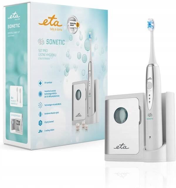 Szczoteczka Soniczna ETA Sonetic Max ETA170790000 Rewolucyjna technologia w opiece o higienę dentalną. Wyśmienita przy rozwiązywaniu kłopotów stomatologicznych. Najważniejsze cechy: typ : soniczna liczba ruchów oscylacyjnych na minutę : 31000 irygator : nie Rodzaj zasilania : akumulatorowe (Li-On) timer : tak akcesoria : 3x końcówki, podstawka do ładowania z lampą odkażającą UV kolor : biały Jeżeli masz wrażliwe zęby, a szukasz odpowiedniego wariantu do ich czyszczenia, to właśnie szczoteczka ETA SONETIC jest tą właściwą. Szczoteczka usuwa płytkę nazębną i czyści przestrzenie między zębami lepiej, niż normalne ręczne szczoteczki. Pomaga przeciwko próchnicy, kamieniu nazębnemu, krwawieniu dziąseł, zapaleniu dziąseł, zapachu z ust i parodontozie. Ma trzy tryby czyszczenia: intensywne i oszczędne czyszczenie oraz tryb masażu dla lepszego przekrwienia dziąseł. Zdrowe dziąsła bowiem oznaczają zdrowe zęby. Głowica szczoteczki jest specjalnie zaprojektowana tak, aby dokładnie kopiowała kształt zębów i linię dziąseł. Perfekcyjnie usuwa wszystkie nieczystości. Mądra i efektywna szczoteczkaSzczoteczka do zębów jest oszczędna przy czyszczeniu zębów i dziąseł, dzięki technologii microBUBBLES i sonicznej technologii MOVE+ potrafi czyścić zęby nawet 31 000 ruchami za minutę i efektywniej usunąć płytkę nazębną i bakterie. Długie działanie dzięki akumulatorowi Li-ion 3,7 V. 2-minutowy czasownik z 30 sekundowymi interwałami pomaga równomiernie czyścić poszczególne części jamy ustnej. Idealna do codziennej higieny ustnej, do czyszczenia implantów, aparatów wyrównujących, mostków i koronek. Szczoteczki są wodoodporne a należą do grupy IPx7. Po użyciu możesz pozbawić szczoteczki aż 99,9% bakterii dzięki światle UV, które dezynfekuje i przygotowuje na następne użycie. Czyszczenie tak będzie maksymalnie higieniczne.Kompletne wyposażenieW zestawie trzy głowice szczoteczki z kolorowym rozróżnieniem i z dobrej jakości włóknami. Do szczoteczek jest dołączony także stojak do ładowania z bezprzewodową technologią i przestrzenią do odkładania wyposażenia. Ma także sygnalizację świetlną eksploatacji i ładowania. ETA na ten produkt udziela dodatkową przedłużoną gwarancję 3 lata na akumulator. Możliwość dokupienia zapasowych szczoteczek: FlexiClean ETA070790100 - Szczoteczka o średnio twardych włóknach, bardziej okrągłym kształcie i większej główce jest bardziej odpowiednia do zębów stałych z większymi przestrzeniami międzyzębowymi, z których dokładnie usuwane są wszelkie zanieczyszczenia WhiteClean ETA070790400 - Szczoteczka o średnio twardych włóknach umożliwia wszechstronne czyszczenie zębów, wybiela zęby nie uszkadzając dziąseł, cięcie włókien umożliwia odwzorowanie kształtu zębów i usuwanie zabrudzeń z przestrzeni międzyzębowych RegularClean ETA070790200 - Szczoteczka z miękkim włosiem jest doskonałym dodatkiem do czyszczenia zębów aparatami stałymi, zębów mlecznych, a także do regularnego czyszczenia płytki nazębnej. Nie nadaje się do masażu dziąseł. SoftClean ETA070790300 - Szczoteczka z miękkimi włóknami, dostosowana do kształtu zębów, delikatnie czyści płytkę nazębną nawet z przestrzeni międzyzębowych, jest odpowiednia dla zębów stałych i wrażliwych dziąseł. Nadaje się również w przypadku zapalenia przyzębia.