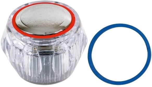 TYCNER Pokrętło Przeźroczyste Z Wkładką Pokrętło przeznaczone jest do montażu na głowicy z wieloklinem 15 zębów. W zestawie jest czerwona i niebieska wkładka do montażu na głowicach odpowiadających za ciepłą i zimną wodę. Zastosowanie: Część zamienna baterii Materiał wykonania: tworzywo sztuczne Kolor dominujący: Transparent 2 nakładki w zestawie : niebieska / czerwona
