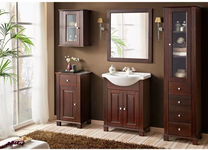 Drewniane meble łazienkowe Retro 65 Drewniane meble łazienkowe z kolekcji Retro w komplecie z ceramiczną umywalką. Meble w całości wykonane z naturalnego drewna które zostało polakierowane na klasyczny brązowy kolor. Wymiary Dane techniczne Materiał frontu: drewno naturalne Zestaw składa się z: Szafki wiszącej (46 / 25 / 57 ), Słupka wysokiego (46 / 35 / 180 ), Słupka niskiego (46 / 35 / 82), Lustro (74 / 2 / 80), Szafki z umywalką o szerokości 65cm (65 / 32 / 81) Wymiary misy: 49 x 29 Waga (w kg): 90 Kolor frontu: Brązowy Styl: Klasyczny Uchwyty: metalowe Zawiasy: Puszkowe Rodzaj mebla: Stojące Montaż: Wymaga montażu Kierunek montażu drzwi: jednostronne (na lewo) Retro to kolekcja mebli łazienkowych, które swoim kształtem oraz mocnym kolorem nawiązują do stylu retro. Łączą one w sobie dystyngowane wzornictwo, bogate akcenty dekoracyjne i okazałość naturalnego drewna. Seria składa się z dwóch szafek pod umywalkę o wymiarach 65 i 85 cm, jednej niskiej szafki stojącej oraz jednej szafki wiszącej. Do wyboru jest również funkcjonalna szafka wysoka, która pomieści wszystkie niezbędne w łazience przedmioty. Drzwiczki szafki wysokiej oraz szafki wiszącej posiadają przeszklenia inspirowane klasycznym wzornictwem. Wnętrza wyposażone w meble z kolekcji Retro nabiorą wytwornego charakteru, a ich użytkownicy docenią ich ponadczasową estetykę.