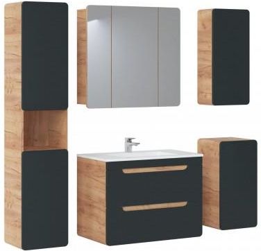 Zestaw mebli: Szafka z umywalką 80cm, Wysoki słupek, Szafka wisząca, Szafka stojąca, Szafka z Lustrem czarny/dąb naturalny, ARUBA Zestaw zawiera: Szafka pod umywalkę 80 cm Umywalka 80 cm Szafka łazienkowa 35x75x22cm Szafka łazienkowa 35x68x32 cm Słupek wysoki 35x170x32 cm Szafka z lustrem Aruba to …