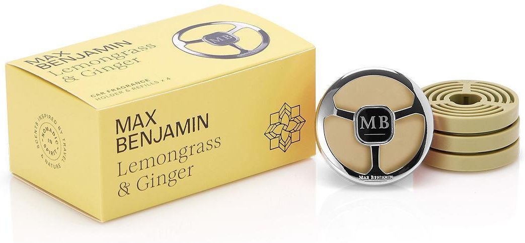 Max Benjamin - Zestaw zapachów do auta Lemongrass and Ginger, uchwyt i 4 wkłady Classic Ten oczyszczający i orzeźwiający zapach inspirowany jest podróżami do południowo-wschodniej Azji, gdzie w powietrzu unosi się aromat tropikalnych przypraw. Naturalne olejki ze świeżej trawy cytrynowej w połączeniu z delikatnie zalesionym korzeniem imbiru dają poczucie spokoju i dobrego samopoczucia.Zestaw zapachowy do samochodu w Twoim ulubionym zapachu Max Benjamin z dozownikiem i 4 wkładami, każdy wkład wystarczy na 30 dni.