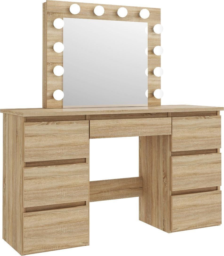 Toaletka z lustrem kosmetyczna BETA 4 12LED sonoma Bazując na toaletce Beta 12 LED, która cieszy się wyjątkowym zainteresowaniem naszych klientów, postanowiliśmy stworzyć kolejny produkt z tej serii toaletek kosmetycznych. Słuchając głosów użytkowników, skonstruowaliśmy produkt większy, bardziej pojemny, a dzięki temu jeszcze bardziej funkcjonalny. Toaletka z lustrem kosmetyczna BETA 4 12LED sonoma jest idealnym pomysłem dla kobiety chcącej zaaranżować swój własny kąt w sypialni, czy garderobie. Sprawdzi się również jako wyposażenie profesjonalnego salonu kosmetycznego. *Taboret dostępny jest w naszych pozostałych aukcjach. ________________________________________ Nowość 2020! Wyprodukowana przez nas w Polsce. Nie jest to produkt importowany! W zestawie z 12 żarówkami LED zupełnie GRATIS! Wykonana z płyty laminowanej o grubości 18mm oraz oklejona obrzeżem z tworzywa sztucznego typu ABS. Posiada aż 7 pojemnych szuflad. Wyposażona w przestronny blat o długości aż 120cm! Lustro (opisane poniżej) z żarówkami LED w neutralnej barwie. Intuicyjna instrukcja montażu podstawy (biurka), stelaż wysyłany jest w całości. W zestawie znajduje się komplet akcesoriów niezbędnych do montażu (konfirmaty, wkręty, mimośrody, kołki i inne). ________________________________________ LUSTRO w komplecie z 12 żarówkami zupełnie GRATIS! Wokół lustra znajduje się aż 12 żarówek LED w najlepszej do robienia profesjonalnego makijażu barwie - białej neutralnej, zapewniającej idealne doświetlenie skóry. Włącznik światła znajduje się z prawej strony lustra - jest intuicyjny w obsłudze, dyskretnie schowany. Do toaletki poprowadzony jest kabel o długości ok. 180cm. W zestawie, oprócz kompletu żarówek znajduje się cała instalacja elektryczna typu plug&play! Wymiary lustra to 80cm szerokości, 65m wysokości, 10cm głębokości. Elementy instalacji elektrycznej oraz żarówki posiadają certyfikat CE. Barwa światła: Neutralna Kolor: Biały Kształt bańki: Kulisty Temperatura barwowa: [K]4000 Żarówka energooszczędna, nienagrzewająca się ________________________________________ Robienie makijażu jeszcze nigdy nie było tak precyzyjne! Nasza Toaletka z lustrem kosmetyczna BETA 4 12LED sonoma to: szerokie, odpowiednio oświetlone lustro, wygodny, przestronny blat, aż 7 szuflad, mogących pomieścić wiele akcesoriów, czy kosmetyków, mnóstwo zadowolonych użytkowniczek mniejszej wersji - Beta 12 LED. ________________________________________ Wymiary ________________________________________ Dostępne kolory