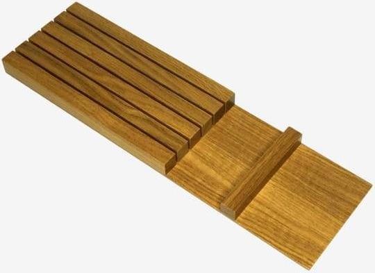 Parametry Wysokość wkładu 26 mmGłębokość wkładu 472 mm Szerokość wkładu 137 mm Kolor dąb Drewniany wkład na noże kuchenne z linii Fine Line MosaiQ, bardzo praktyczny i wygodny w użytkowaniu. Wkład mieści się w każdej szufladzie i w którym można przechowywać w bezpieczny sposób pięć noży. Zestawiony z innymi elementami z tej samej linii tworzy unikatowy wystrój szuflady. Wykonany z drewna dębowego, bardzo trwałego i niezwykle mocnego. Wymiary zestawu: szer.: 137 mm, dł.: 472 mm, wys.:45 mm. Wymiary wraz dodatkową rynienką: szer.: 154 mm, dł.:472 mm, wys.: 49 mm. Szerokość wkładu pozwala na umieszczenie kilku elementów w jednej szufladzie. Różnorodny asortyment elementów drewnianych jaki posiadamy w ofercie umożliwia własne i indywidualne zagospodarowanie wnętrz każdej szuflady. Do tego wkładu należy domówić rynienkę (kod produktu 07.353.D), zapewniającą stabilizację elementu w szufladzie.