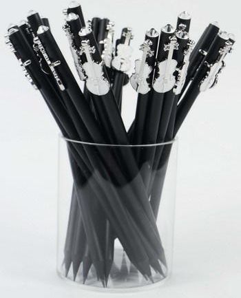Ołówek ze skrzypcamiCzarny ołówek z ozdobą w kształcie białych skrzypiec.