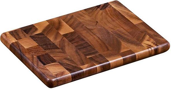 Akacjowy blok do krojenia. Gruby prostokątny blok do krojenia jest ciężki i stabilny. Wykonany z akacjowego drewna, jest bardzo mocny i trwały – twardość i odporność akacji na ścieranie odpowiadają właściwościom drewna dębowego. Charakterystyczny ciemnobrązowy kolor, a także wyraźnie widoczne słoje oraz zaokrąglone brzegi bloku sprawiają, że będzie on nie tylko przydatnym elementem kuchennego wyposażenia, lecz także stylową dekoracją wnętrza.