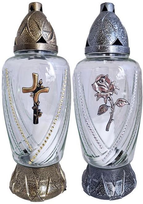 Znicz szklany ze srebrnym lub złotym zdobieniem Szklany znicz ze zdobieniem w kształcie róży lub krzyża. Znicz posiada plastikową podstawkę oraz pokrywkę, dzięki której płomień nie zgaśnie. Do wyboru dwa wzory: złoty krzyż lub srebrna róża. Zależy Ci na konkretnym kolorze lub wzorze? Dodaj taką informację w uwagach do zamówienia. Jeśli tego nie zrobisz, wyślemy go losowo.