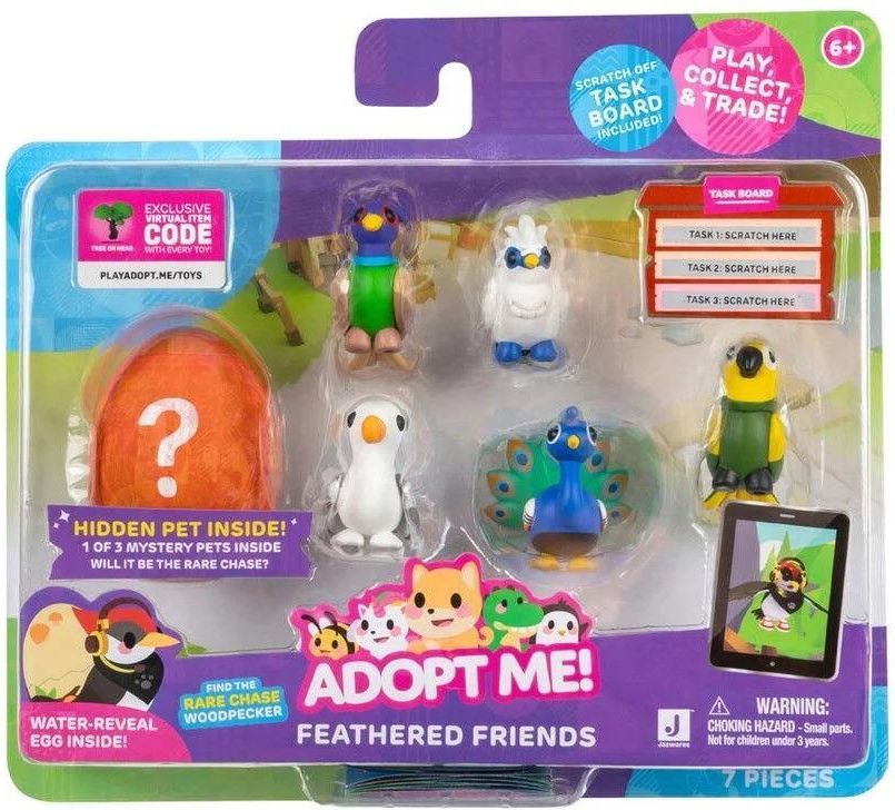 Ukryte zwierzątko: aby odkryć jeden z trzech zwierząt niespodzianek, najpierw wyjąć opakowanie, a następnie zanurzyć jajko w wodzie. Zwierzęta domowe: 6 zwierząt domowych Adopt Me Pets jest rzadkością od zwykłych po legendarne. WIRTUALNY Kod ITEM: Zrealizuj swój wirtualny przedmiot Adopt Me UGC, aby wyposażyć swój awatar na całej platformie. Deska do zadań: zdrap trzy zadania na desce, tak jak w grze. Do zabawy i kolekcjonowania: ten zestaw zawiera 6 ptaszków dla Twojej kolekcji Adopt Me