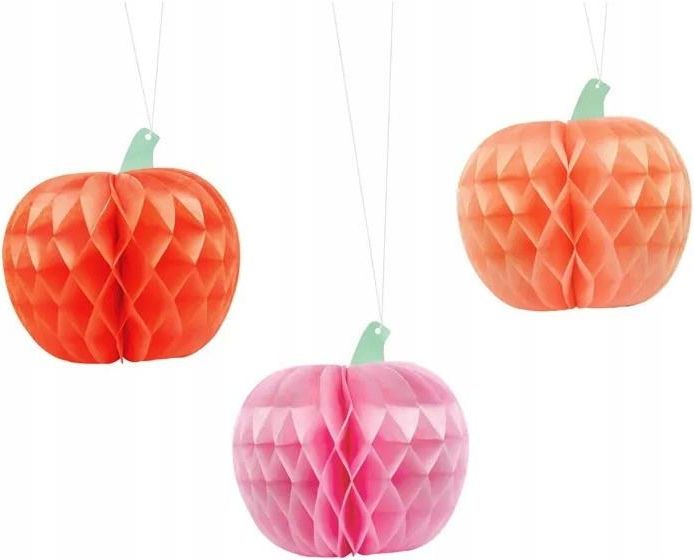 Dekoracja bibułowa Dynie Halloween - 24 cm, 3 szt Dekoracja halloweenowa w kształcie dyni wykonana z kolorowej bibuły. Dynie posiadają sznureczki, dzięki którym z łatwością powiesisz je przy oknie, nad stołem, pod sufitem lub na ścianie. Zawieszki dynie będą doskonałą dekoracją przyjęcia halloweenowego, imprezy tematycznej lub szkolnego balu przebierańców. KOLOR: pomarańczowy, różowy. ROZMIAR: 24 cm OPAKOWANIE: 3 szt.